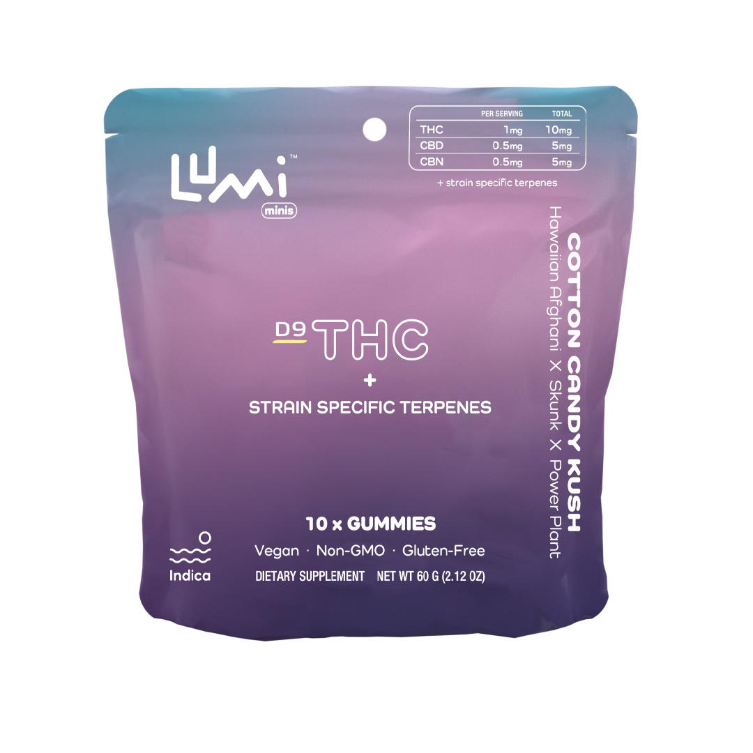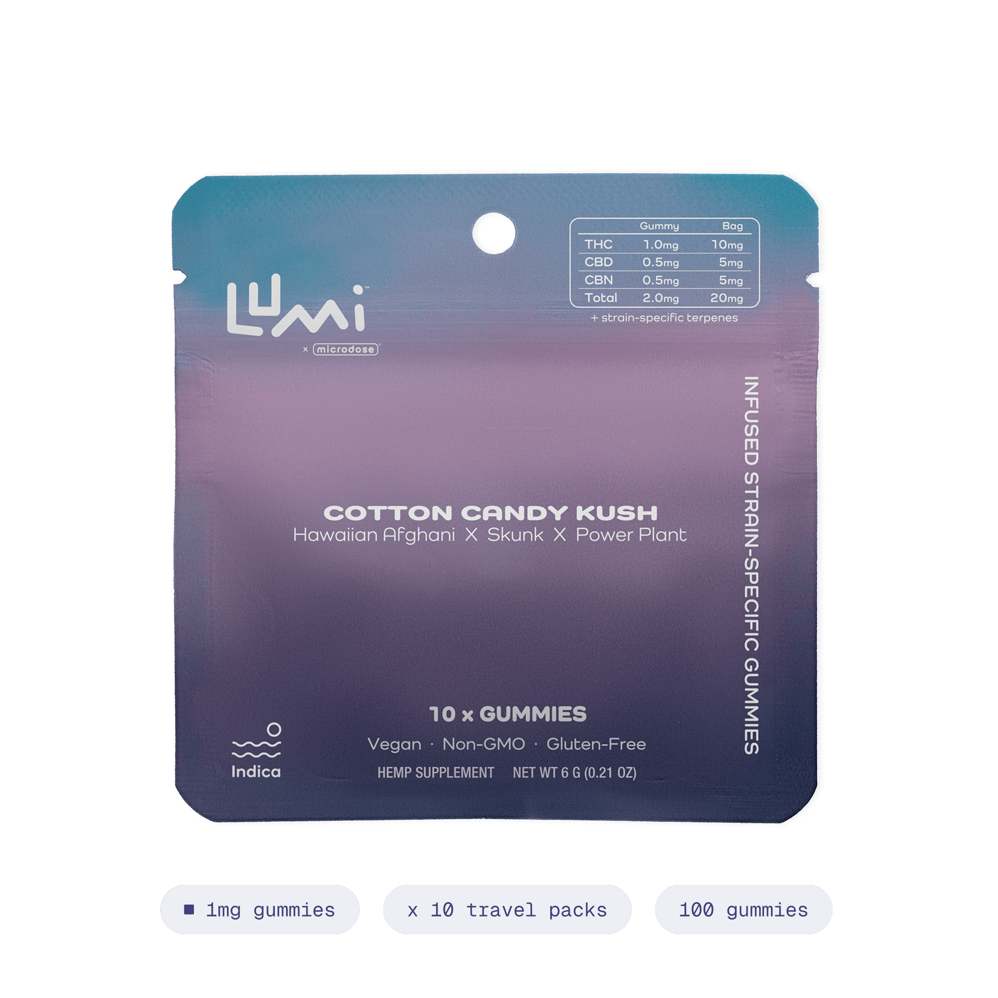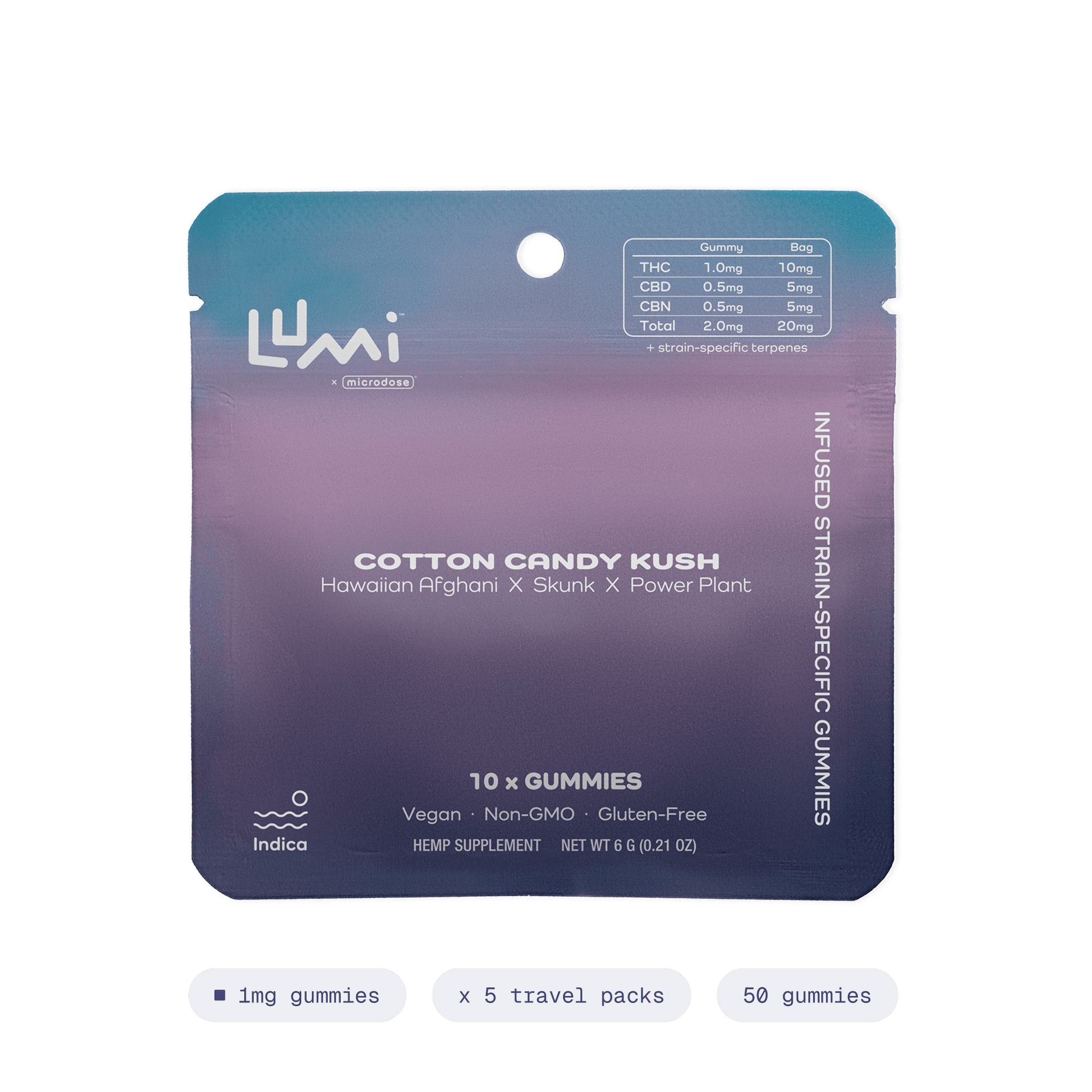 Each Cotton Candy Kush Mini gummy contains 1mg of THC + 1mg of therapeutic cannabinoids and strain-specific terpenes.