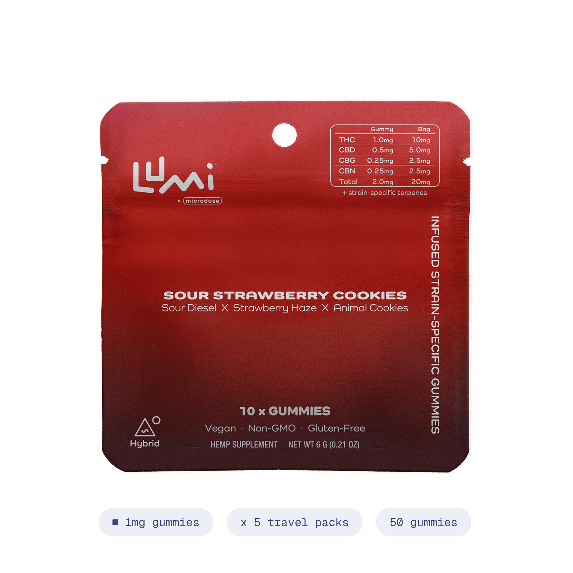 Each Sour Strawberry Cookies Mini gummy contains 1mg of THC + 1mg of therapeutic cannabinoids and strain-specific terpenes.